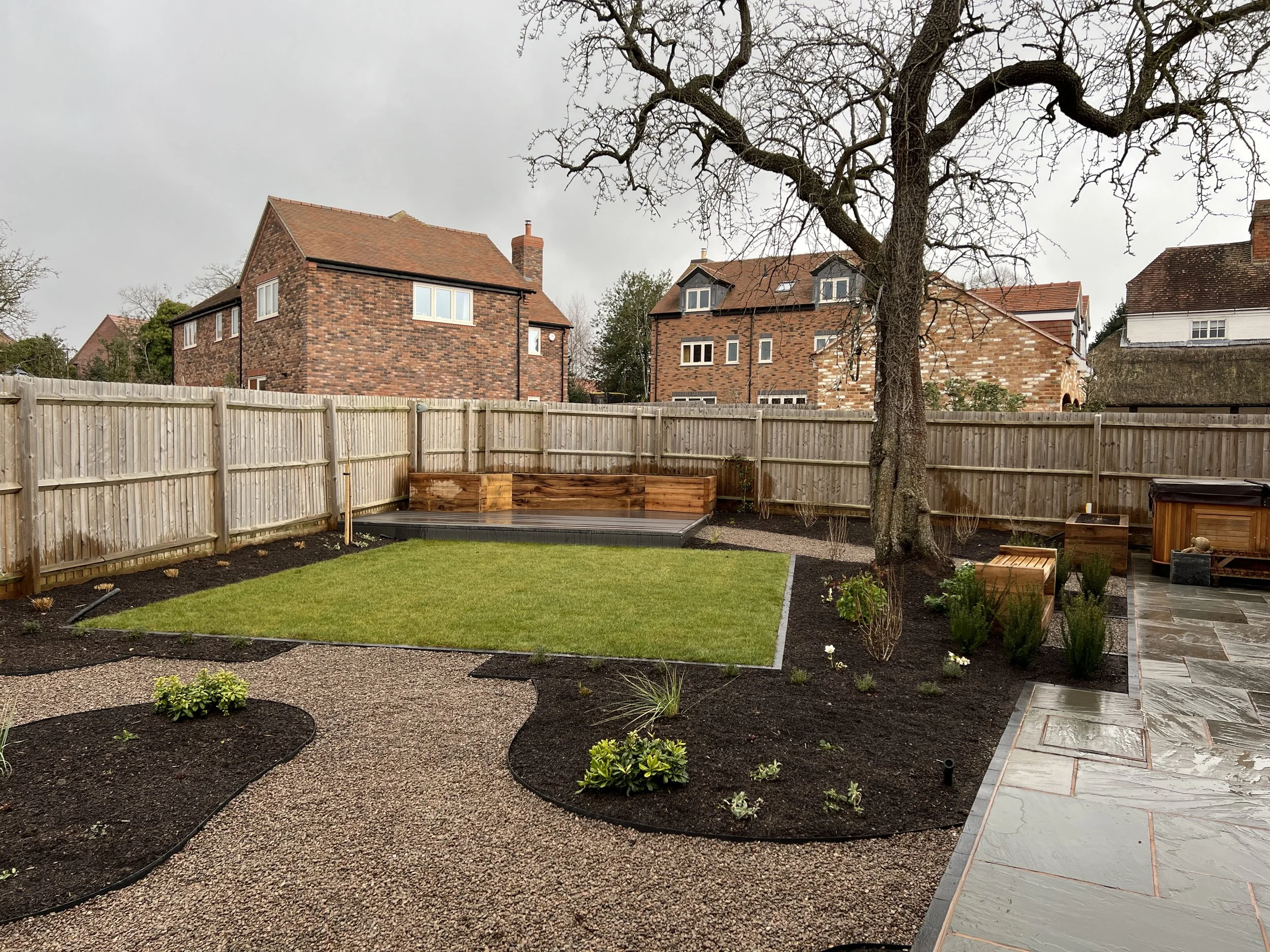 A new build garden with an existing mature pear tree. This design features space to entertain and play.